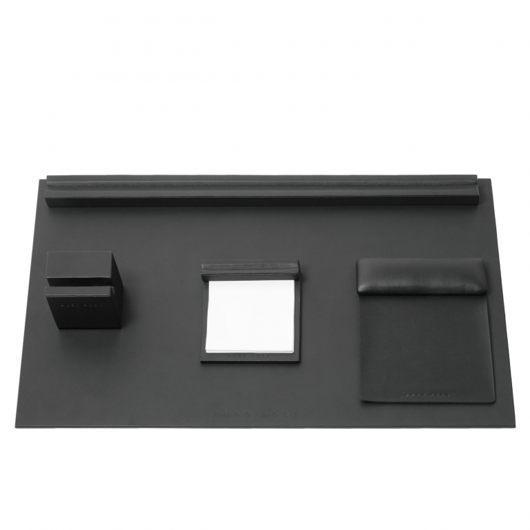 Dress up your home or office desk with a touch of luxury! The resolutely modern desk set crafted in a mix of grained and soft textures is composed of a comfortable desk pad, an iPhone / iPad stand designed to hide the charging cable, a soft mouse pad and an A6 note holder. Thanks to their magnetic strength, both desk pad and note holder will help you to organise your desk in a perfect way and the curved surface will allow securing your pens. Dimensions are as follows: Desk pad: 62 * 48 cm, iPhone stand: 8 * 8 * 5 cm, Note holder: 16.5 * 12.5 cm, Mouse pad: 24.5 * 16.5 cm.