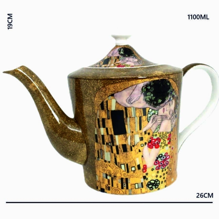 Фарфоровый чайник, украшенный репродукцией картины Густава Климта «Поцелуй», в подарочной коробке. Объём: 1000 мл. Чайник/кофейник Густава Климта Объем: 1 литр Фарфор с крышкой и золотой окантовкой Подарочная коробка с изображением картины Густава Климта «Поцелуй» Высота около 18 см, ширина 25 см, диаметр 10,5 см